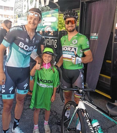 Der Samerberger Radprofi Marcus Burghardt (links) hat selbst zwei Töchter und als er die kleine Elisabeth aus Tschechien vor dem Bus vom Team Bora – hansgrohe sah, die unbedingt ein Autogramm von Weltmeister