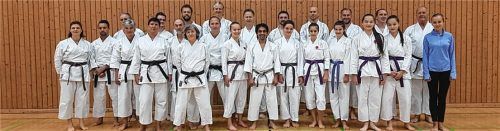 Julian Chees (6. Dan/Bildmitte), Bundesstützpunkttrainer sowie dreimaliger Europa- und Weltmeister in der Kata kam zu einer von Spartenleiter Norbert Dank organisierten Trainingseinheit nach Feldkirchen. Nach einem abwechslungsreichen Kindertraining war die Kata Gojushiho-Dai Gegenstand der Erwachse