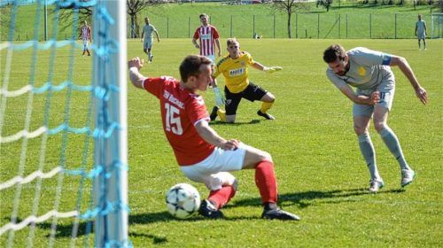 Dieses war der vierte Streich: Franz-Xaver Pelz, Kapitän des Fußball-Bezirksligisten ASV Au trifft hier zum 4:1 für die Gastgeber im Heimspiel gegen den TSV Buchbach II. Mit dem Erfolg haben die Auer ihre Negativserie von sechs sieglosen Begegnungen beendet und schöpfen im Kampf um den Klassenerhalt