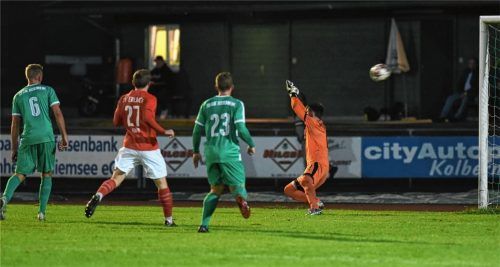0:4-Heimschlappe für den Fußball-Landesligisten SB Rosenheim am Freitagabend im Heimspiel gegen Erlbach. Nach einer ausgeglichenen Anfangsphase übernahmen die Gäste immer mehr das Kommando. Nach dem 1:0 (Bild) in der 22. Minute durch den dreifachen Torschützen Sebastian Hager lief das Spiel eindeuti