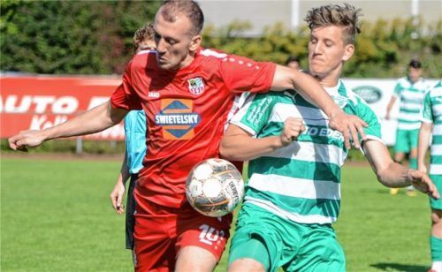 Auf diesem Bild sieht es so aus, als wäre das Derby zwischen dem SB/DJK Rosenheim und dem SB Chiemgau Traunstein in der Fußball-Landesliga Südost auf Augenhöhe verlaufen. Traunsteins Goran Divkovic und Rosenheims Lukas Ugolini (rechts) befinden sich im energischen Duell um den Ball. Vom Ergebnis her