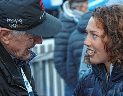 Zum ersten Mal ist Laura Dahlmeier – hier im vertrauten Gespräch mit dem früheren Weltverbands-Vizepräsident Heinz Billino aus Tüßling – in Ruhpolding nur neben der Strecke im Einsatz: Sie ist Expertin für das ZDF bei den Rennen der Damen. Da hat die Olympiasiegerin auch über eine Besonderheit in de