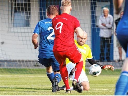 Die Rekordkulisse in den Wochenspielen der Fußball-Kreisliga stellte das Holzland-Derby zwischen dem TSV Reischach und der SG Perach/Winhöring. Knapp 400 Zuschauer sahen den Reischacher 2:1-Erfolg. Hier rettet Hausherren-Tormann Alexander Müller in höchster Not.Foto Gabi Zucker