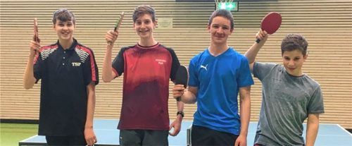 Florian Deiml und Fabian Laforsch, die beide nur eine Niederlage hinnehmen mussten, hatten großen Anteil daran, dass der TSV Wasserburg in der Bezirksklasse A, Gruppe 1, den Titel mit 10:0 Punkten holte. Von links nach rechts: Paul Hiebl, Florian Deiml, Jonas Witten, Florian Widmann; Auf dem Bild fe