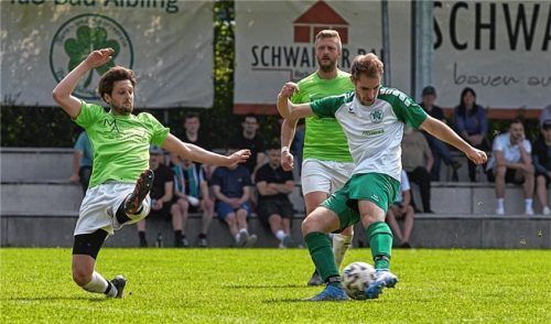 Der Fußball-Kreisligist TuS Bad Aibling hat mit einem 3:1-Heimsieg gegen Vogtareuth den Klassenerhalt endgültig geschafft, während die Gäste am letzten Spieltag auf ein kleines Wunder hoffen müssen. Der dreifache Bad Aiblinger Torschütze Fabian Troffer erzielt mit diesem Schuss den 1:1-Ausgleich. Fo