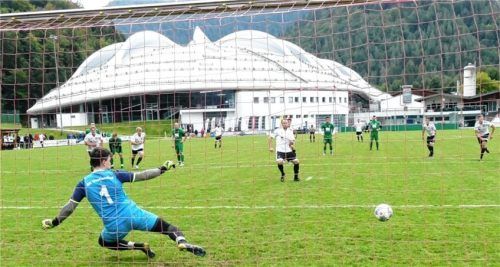 Hinten die futuristisch anmutende Eisschnelllauf-Halle (Max-Aicher-Arena) in Inzell und vorne der entscheidende Elfmeter. Inzells Andi Dießbacher verlud Vachendorfs Torhüter Thomas Ortner und erzielte den 3:2-Endstand in einer spannenden Kreisligapartie. Mit zwei Treffern avancierte Dießbacher zum M