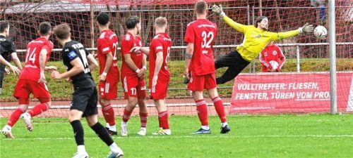 Mit diesem direkt verwandelten Freistoß von Tobias Hofbauer (vorne) ist der SV Erlbach im Inn/Salzach-Duell der Fußball-Bayernliga Süd beim TSV 1860 Rosenheim mit 1:0 in Führung gegangen. Dieser Treffer war in einem zerfahrenen Spiel schon eine Art Vorentscheidung, am Ende siegte Erlbach 2:0.Foto Ha