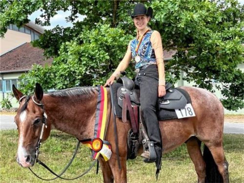 Nächster Erfolg für Larissa Weber: Die Westernreiterin hat bei den internationalen deutschen Meisterschaften German Paint in Kreuth zwei Medaillen geholt. Sie und ihr Pferd Freddy setzten sich im Open Western Riding all Ages an die Spitze (Bild), im Amateur Western Riding sicherten sie sich zudem de
