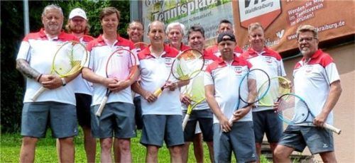 Die Herren 50 des TC im VfL Waldkraiburg steigen in die Südliga 1 auf. Auf dem Bild: Andy Schwarz, Roland Sterr, Tilmann Lösken, Benno Zelger, Bernd Edbauer, Robert Hiltmann, Peter Kitzeder und Emil Kirchmeier.