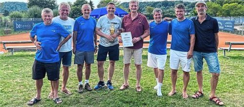 Die Herren 55 I des TV Feldkirchen wurden Bayernliga-Meister und steigen in die Regionalliga auf. Von links: Fritz Hauser, Horst Nadjafi, Till Götzner, Jan Polland, Andreas Poser, Manfred Hauser und Matthias Kreitmeier.