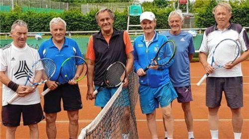 Die Herren 70 des SV DJK Götting wurden Meister in der Landesliga 2 und steigen in die Landesliga 1 auf. Von links: Fritz Beranek, Sepp Poschauko, Bernhard Schweiger, Schorsch Manhart, Steffen Lehmann und Reinhard Eisenhammer.