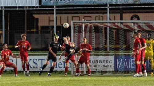 Da staunt selbst Traunsteins Spielertrainer Danijel Majdancevic (links), als der Angreifer der Sportfreunde Schwaig im Punktspiel der Fußball-Landesliga Südost spektakulär zum Fallrückzieher ansetzt. Am Ende triumphierten aber die Gastgeber um Majdancevic mit 3:0 – da nutzt dann selbst die schönste