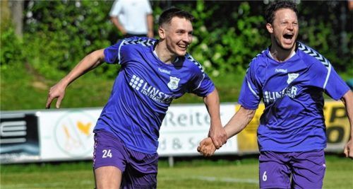 Jubel beim SV Aschau/Inn: Die „Veilchen“ haben das Spitzenspiel in der Fußball-Kreisliga 1 gegen Tabellenführer TuS Prien mit 2:0 gewonnen und nach Punkten zu den Chiemseern aufgeschlossen. Für die Aschauer trafen Johannes Asanger (rechts) in der ersten Hälfte und Jan Vetter (links) nach dem Wechsel