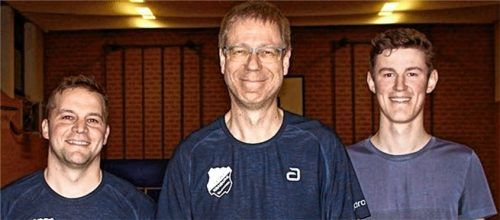 Die Herren des TV Kraiburg sicherten sich in der Bezirksklasse C, Gruppe 1, die Meisterschaft mit 26:6 Punkten und steigen in die Bezirksklasse B auf. Von links nach rechts: Michael Mandl, Jürgen Konrad, Elias Hahn.