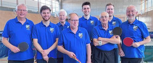 Die Herren des ASV Rott/Inn wurden in der Bezirksklasse D, Gruppe 2, mit 28:4 Punkten Meister und steigen in die Bezirksklasse C auf. Von links nach rechts: Ferdinand Scheidegger, Lukas Niggl, Fritz Laberg, Rainer Ried, Damiano Coppola, Franz Tschetsch, Florian Lederhuber, Richard Dullinger. Auf dem