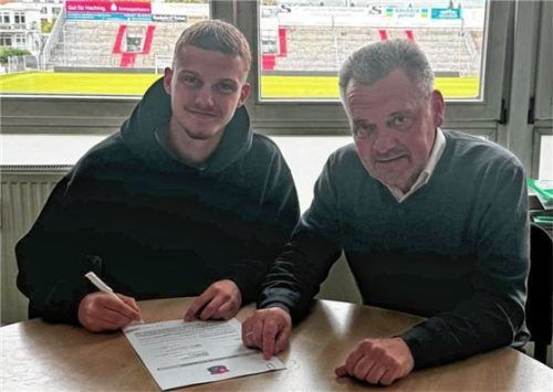 Nachwuchstalent Dominik Köck unterzeichnet seinen ersten Profivertrag bei der SpVgg Unterhaching. Der 18-jährige Köck, der beim TSV Emmering begann, kam zur Saison 2023/24 vom TSV 1860 Rosenheim zur U19 der SpVgg Unterhaching. Haching-Präsident Manfred Schwabl (rechts) erklärte: „Dominik ist ein seh