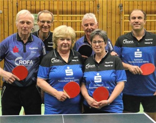 Die Herren und Damen des SV DJK Kolbermoor VI wurden in der Bezirksklasse D, Gruppe 4, mit 32:0 Punkten ungeschlagen Meister und steigen in die Bezirksklasse C auf. Auf dem Bild von links: Adalbert Denk, Ulrich Krapf, Margit Weingartner, Günter Häke, Helga Effenberger und Karl-Heinz Grieshober. Auf