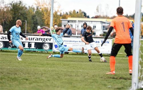 Mit vollem Einsatz verteidigt der TSV Breitbrunn-Gstadt in dieser Szene sein Tor im Spiel beim SV Amerang. Nicht immer mit Erfolg, denn die Mannen vom Chiemsee mussten gleich drei Gegentreffer hinnehmen, das Engagement hat sich aber dennoch gelohnt, weil die Gäste mit einem 4:3-Erfolg die drei Punkt