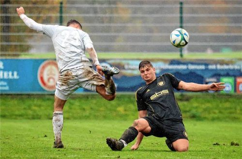 Kampf war Trumpf im Spitzenspiel der Fußball-Kreisliga 1 zwischen dem FC Grünthal und dem TuS Raubling. Hier duellieren sich Raublings Michael Gruber (links) und der Grünthaler Jakob Obermayr um den Ball. Vor 170 Zuschauern in Unterreit holten sich die Gäste aus dem Inntal mit 1:0 den Sieg und sind