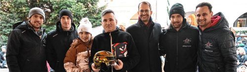 Den Goldhelm vom letztjährigen Topscorer Charlie Sarault aus der vorjährigen DEL2-Saison trägt ab sofort Korbinian Limmer aus Bad Feilnbach. Vorgezogenes Weihnachtsgeschenk für den Jugendlichen, dessen Vater Oliver beim Christkindlmarkt-Event der Starbulls den handsignierten Helm für 180 Euro erstei