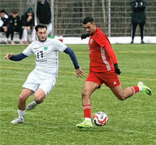 Fußball-Landesligist TSV 1860 Rosenheim hat sein Testspiel beim Süd-Bezirksligisten 1. FC Penzberg mit 3:2 gewonnen. Nach dem 0:1-Pausenrückstand drehten Audai Elgathous (rechts im Bild gegen Penzbergs Samir Neziri), Michael Summerer und Tobias Bensch das Spiel mit ihren Toren zugunsten der Rosenhei