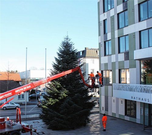 Tage wurden die Sterne an den Straßenlaternen entlang der Rosenheimer Straße angebracht, ebenso die Lichterketten auf dem Platz vor dem Alten Rathaus (rechts oben). Gestern nahmen sich die Bauhofmitar