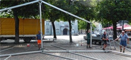 Schon am Samstag haben (von links) Franz Draxinger, Andreas Seidl, Sebastian Voracek und Eberhardt Freimoser vom Bauhof mit dem Aufbau des großen Zeltes für die XIII. Schmiede-Biennale begonnen. Eröffnet wird sie am Mittwoch um 18 Uhr von Schirmherrn und Wirtschaftsminister Hubert Aiwanger, der auch