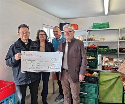 Zur Freude der Tafelhelfer überreichte Pfarrer Maurus Scheurenbrand von der Stadtkirche Kolbermoor (linkes Bild von links), begleitet von Verwaltungsleiterin Jutta Bürstlinger und Kirchenpfleger Franz Stadler (rechts), bei seinem Besuch einen symbolischen Spendenscheck in Höhe von 1000 Euro an Tafel