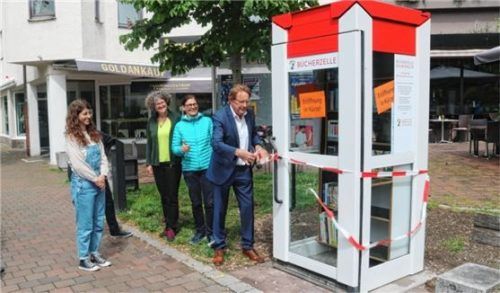 Gestern durchschnitt der Zweite Bürgermeister Dieter Kannengießer das Band zur Eröffnung der neuen Bücherzelle in Kolbermoor. Kurz danach waren schon die ersten Interessenten zum Stöbern vor Ort. Foto Riediger