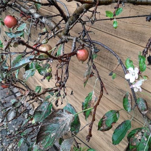 Eine ungewöhnliche Entdeckung machte Kurt Gilk in seinem Garten in Kolbermoor. Er staunte nicht schlecht, als er neben den reifen Äpfeln an seinem Apfelbaum eine Blüte fand.Foto gilk