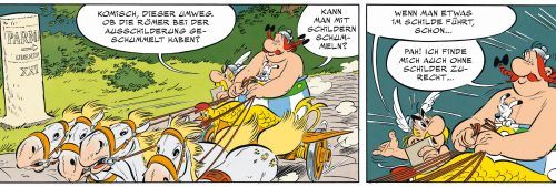Wir befinden uns zwar immer noch im überaus ereignisreichen Jahr 50 vor Christus. Doch so langsam halten die modernen Zeiten Einzug in Gallien. Obelix bekommt Konkurrenz durch neuartige, federleichte Hinkelsteine aus Bimsstein vom Vesuv. Er denkt an berufliche Veränderung, zumal i