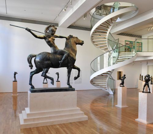 Weg ist sie – die Amazone vor der Villa Stuck. Sie ist in unserer Wahrnehmung so verschmolzen mit Franz von Stucks Münchner Wohnsitz, dass wir ihr Verschwinden nicht bemerkt haben. Die Kämpferin ist nach innen gewandert – in Stucks Neues Atelier. Dort bi