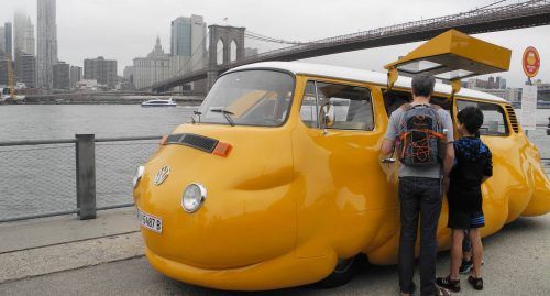 Erwin Wurm parkt einen Hotdog-Bus in New York