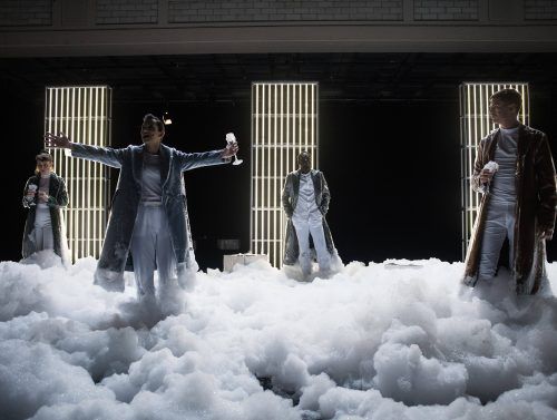 Das war doch mal ein flockiger Abend – zumindest im wörtlichen Sinn. Denn die ganze Bühne ist mit einem hüfthohen Schaumgebirge bedeckt in der Kammer 2 der Münchner Kammerspiele. Einsam ragt ein Megafon aus der weißen Pracht, durch das man zur Einstimmung Angela Merkel im O-To