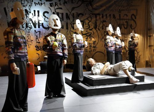 Ein überdimensionierter Säugling weist dem eintretenden Publikum im Eingangsbereich der Münchner Reithalle den Weg. Das Ziel: ein Kubus aus dicker Klarsichtfolie, bemalt mit Sprüchen und Skizzen, wie man sie auf öffentlichen Toiletten finden kann – oder an den Wänden einer Todesze