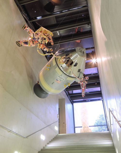 Den Anflug auf den Mond machen wir mit der Raumkapsel „Martin Luther“. Um die schweben an ihren Nabelschnüren Astronauten, pardon, Afronauten, in poppigen Raumanzügen. Yinka Shonibare CBE begrüßt mit seiner Decken-Installation im Salzburger Museum der Moderne auf dem Mönchsb