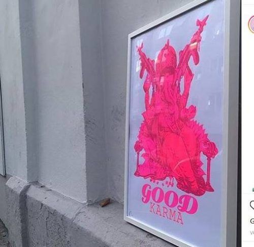 Bam! Plötzlich fühlt man sich wieder wie mit zwölf. Gestern früh kurz nach 7 Uhr flippt ein Foto aufs Smartphone: „Good Karma“ in Pink, gerahmt. Eine Arbeit von Laura Piantoni steht da auf einem Mauervorsprung irgendwo in der Stadt. Aber wo? Verdammt, diese Farbe der Hauswand