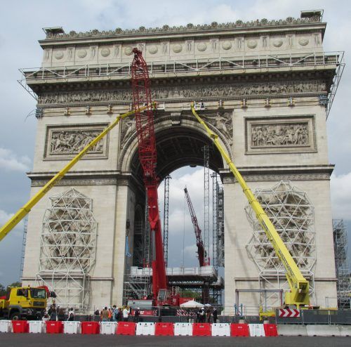 Hohe Kräne und ein beeindruckendes Stahlgerüst: Rund um die Uhr arbeiten drei Teams derzeit an den Vorbereitungen zur Verhüllung des Pariser Triumphbogens. Bis zur Einweihung am 18. September ist zwar noch etwas Zeit. Doch jetzt schon lockt die Aktion zahlreiche Schaulustige an.