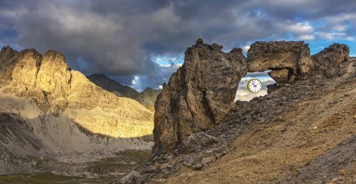 An der Fuorcla digl Leget bleibt die Zeit stehen. Buchstäblich. Denn je näher man der Uhr kommt, die da auf 2650 Metern zwischen zwei Felsen hängt, desto langsamer bewegen sich deren Zeiger. Bis sie, steht man genau davor, ebenfalls zum Stehen kommen. Selbst der pinke Sekundenmesser