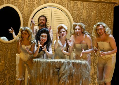 Die Stimmung ist nicht gut zu Beginn des Abends. Die bunte Truppe im schlossähnlichen Bühnenbau mit seinen Goldtapeten und roten Samtvorhängen langweilt sich schier zu Tode. Und lamentiert lauthals darüber, in wunderbar dadaistischen Wortkaskaden. „Den Dingen ist eine Tendenz der E