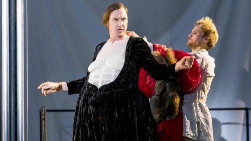 Was für ein Gemächt! Jedermann präsentiert es gern. Breitbeinig sitzt er da, in seinem königlichen Wams. Renate Martin und Andreas Donhauser (Bühne/Kostüme) haben einen Phallus in Lars Eidingers Jedermann-Kostüm genäht. Überdeutlich wird die Botschaft, die der Schauspieler selbst mit seiner Interpre