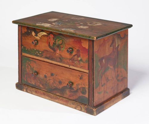 Was für eine entzückende Schweinerei! Eine Sau mit dickem Gesäuge und umgeben von ihrer Ferkelschar ziert die massive hölzerne Kommode. Anderswo ist ein prächtiger Hahn zu entdecken, der freilich nur ein „Piep“ herauszukrähen vermag, das einige Rehe verwundert stutzen lässt. Dies