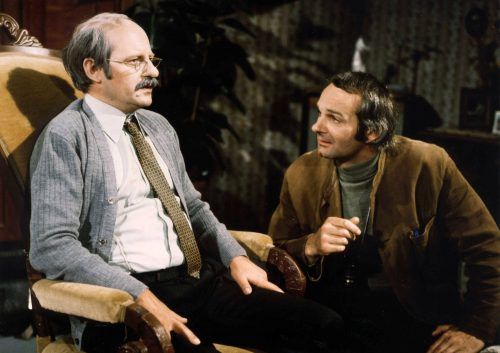 Wenn die Kamera läuft, geht bei Laien schief, was für Profis kein Problem ist. So auch beim fiktiven Rentner Erwin Lindemann (Heinz Meier, li., hier mit Claus Dieter Clausnitzer als Regisseur), der fürs Fernsehen „nur“ sagen soll, was er mit seinem Lottogewinn machen wird. Bekanntlich bringt Lindema