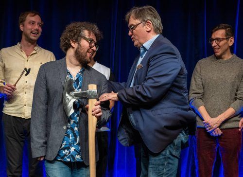 Kerkeling überreicht dem Kabarettisten David Stockenreitner das ScharfrichterBeil