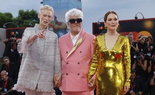 Auch modisch ganz vorne: Tilda Swinton (li.), Pedro Almodóvar und Julianne Moore auf dem roten Teppich. © J