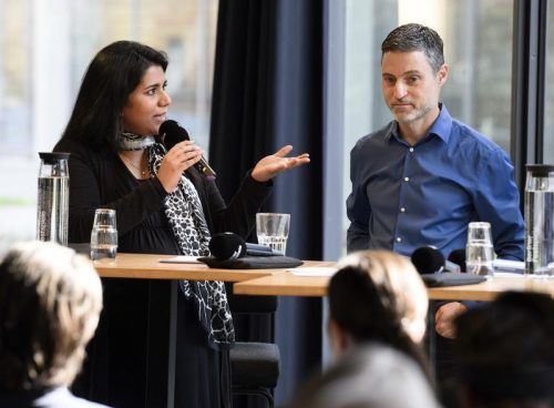 Unfreiwillige Vorbild-Funktion: die Muslimin Saba-Nur Cheema (li.) und ihr Mann Meron Mendel, der Jude ist, heuer bei einem Auftritt in Berlin. © Bernd von Jutrczenka/Picture Alliance