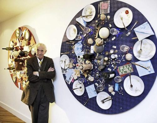 Speisereste und dreckiges Geschirr: Daniel Spoerri neben zwei seiner Bilder. © dpa