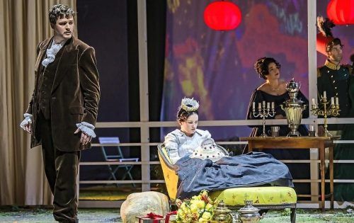 Mit Zitaten des 19. Jahrhunderts spielt diese Nürnberger Inszenierung, hier eine Szene mit Samuel Hasselhorn in der Titelrolle und Tetiana Miyus als Tatjana. © Bettina Stoess