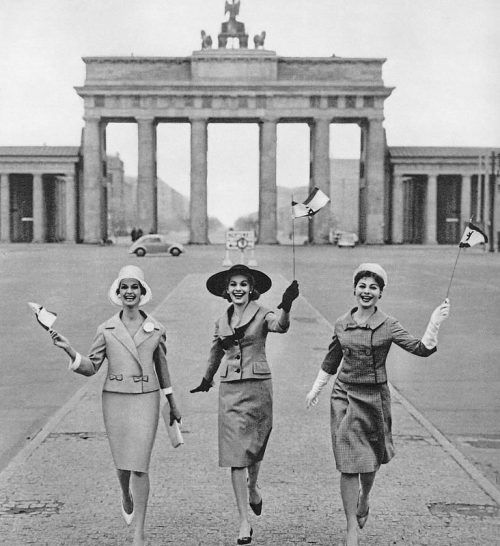 Models im Jahr 1959 vor dem Brandenburger Tor. Die Aufnahme entstand für eine Fotostrecke im Magazin „Constanze“, das von 1948 bis 1969 erschien. © Helmut New
