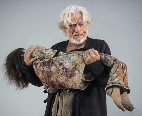 Jürgen Prochnow, 2018 als Hunnenkönig Etzel, hält in der Inszenierung der Nibelungensage „Siegfrieds Erben“ seinen toten Sohn. © Andreas Arnold / dpa